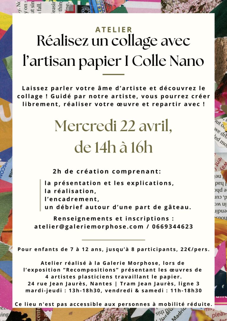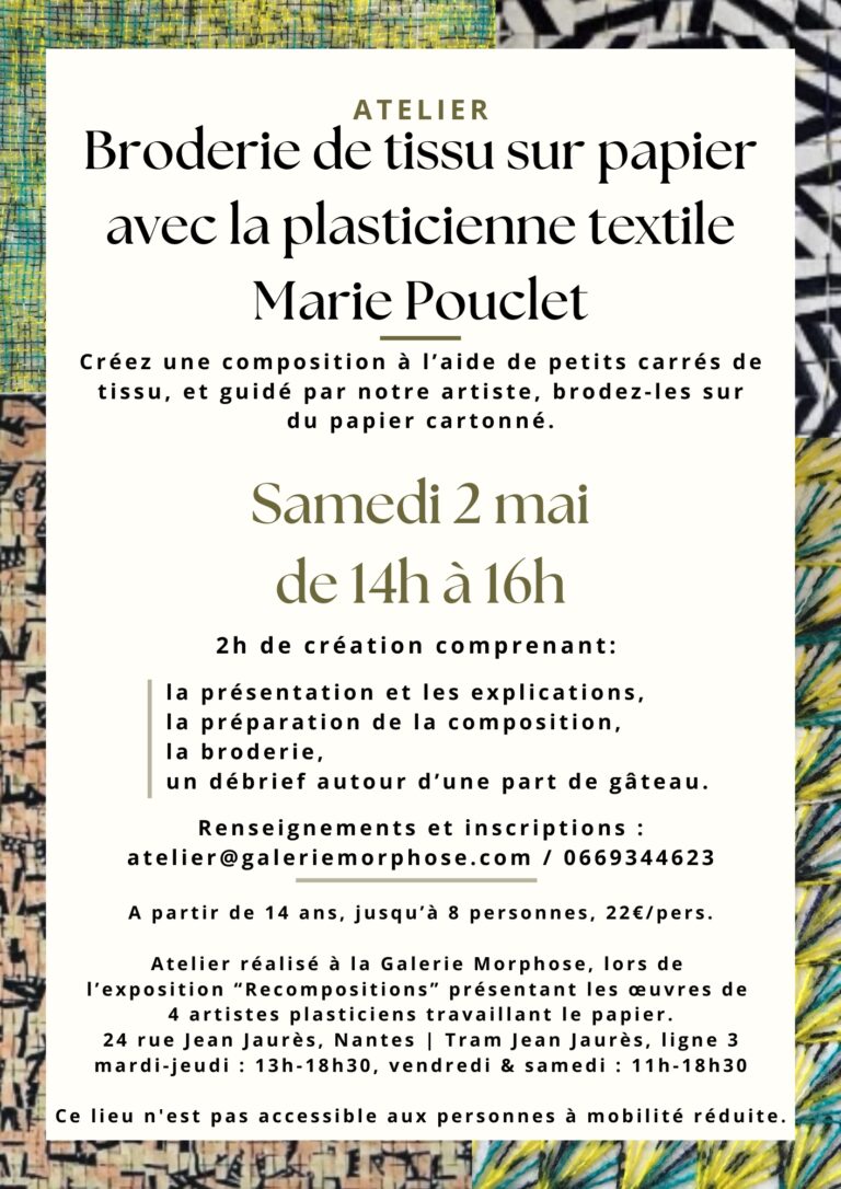 > Tous les ateliers sont réalisés à la Galerie Morphose, 24 rue Jean Jaurès, Nantes.